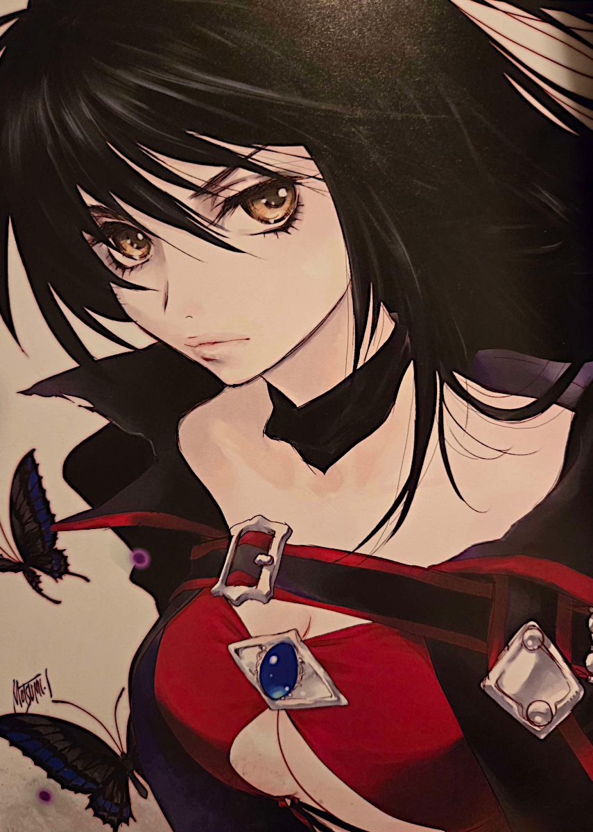 Regarding the costume, I was given the thought that, apart from black being the main theme, the clothes shouldn’t be neat, so I said, “Then I’ll tear them up” and so it turned to tatters. When I was wondering if it was alright, Iwamoto told me, “You’ve finally defiled it” and I thought, “It’s fine to ruin it so much!?” (laugh). Her heart has deep scars and she thinks only of revenge, so it makes sense that she would be indifferent to her messy clothing. I thought about it a lot. While I was drawing, I suddenly thought, “I should change these clothes” (laugh). The costume design, the chest design, it was all becoming jaggy. Still, I liked it.